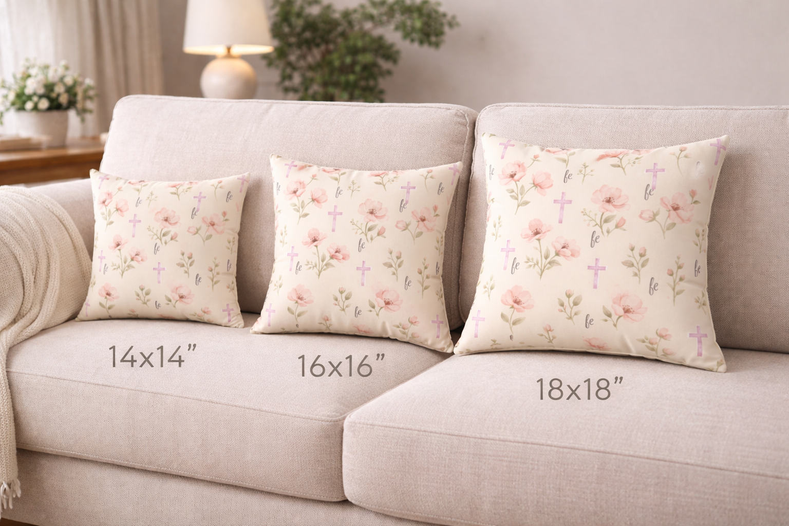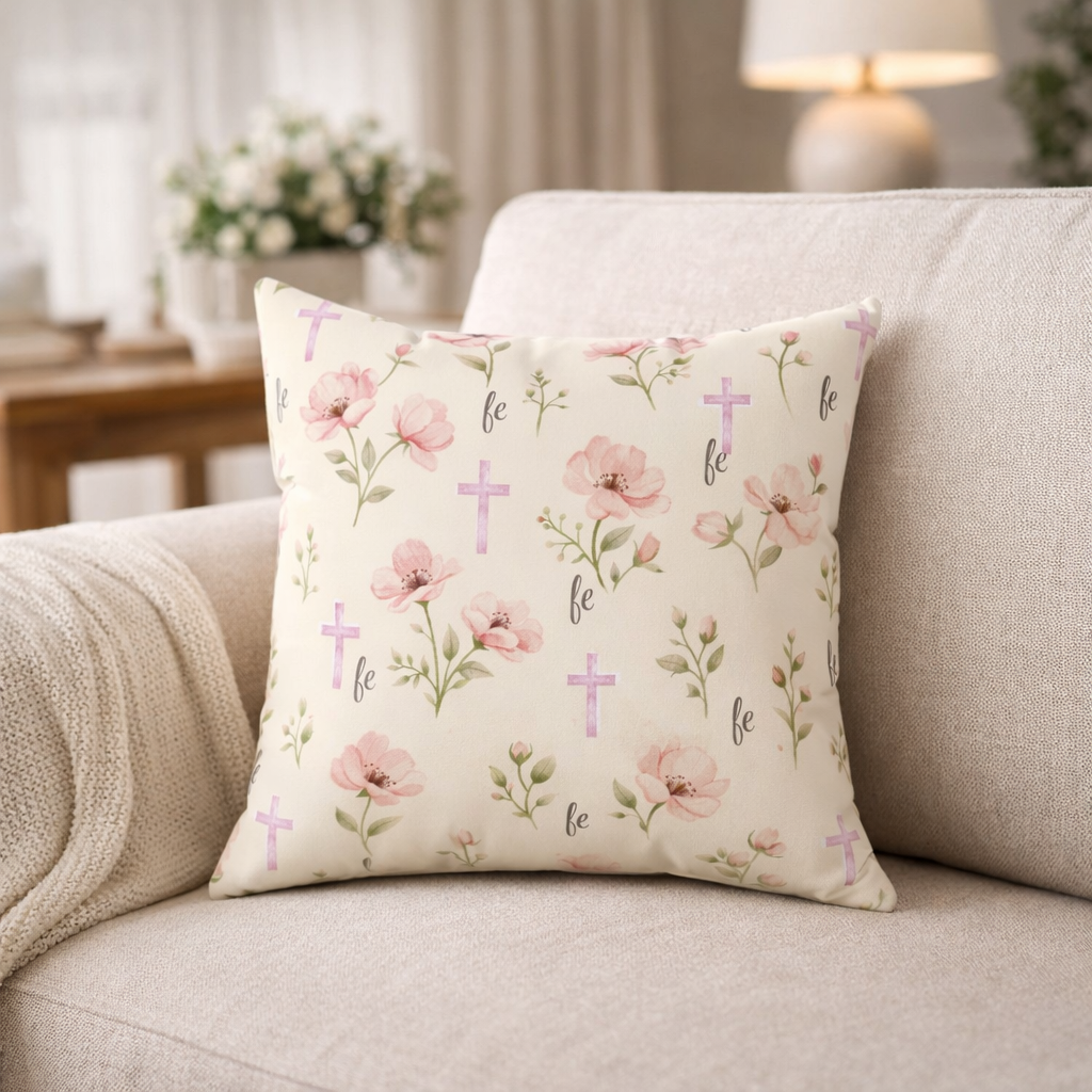 Llena tu hogar de paz, fe y delicadeza con nuestro cojín decorativo “Fe que Florece”.